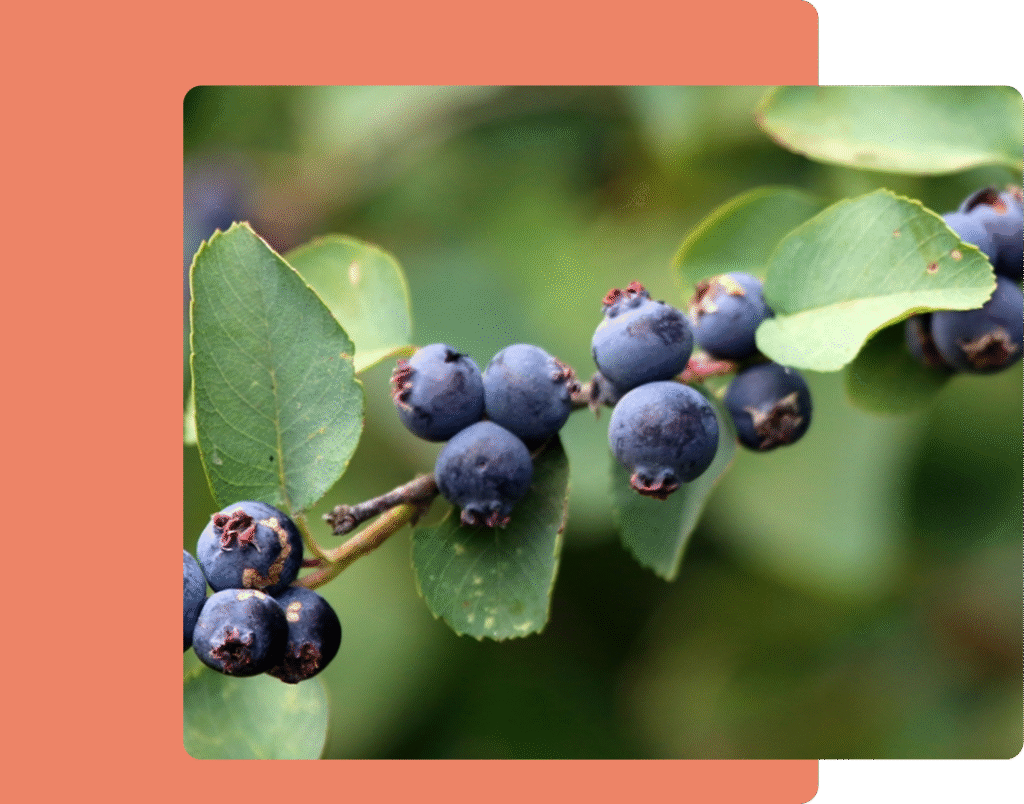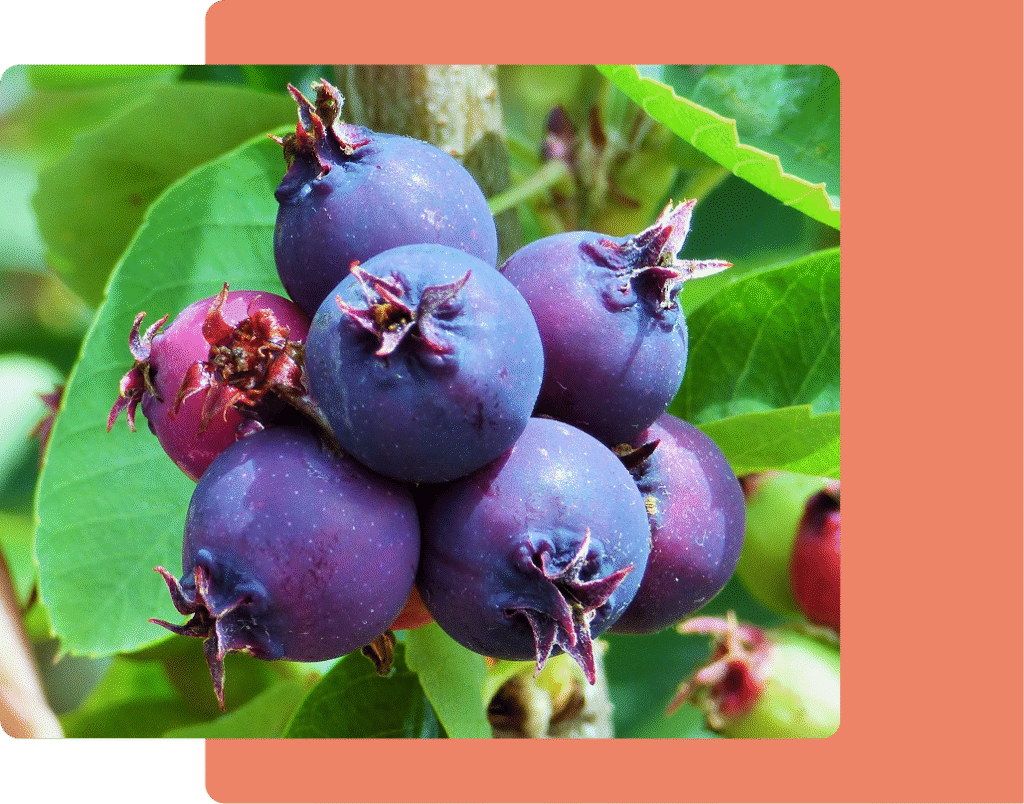 ● Height: Up to 30 feet ● Leaves: Oval with fine teeth ● Berries: Purple-black and sweet